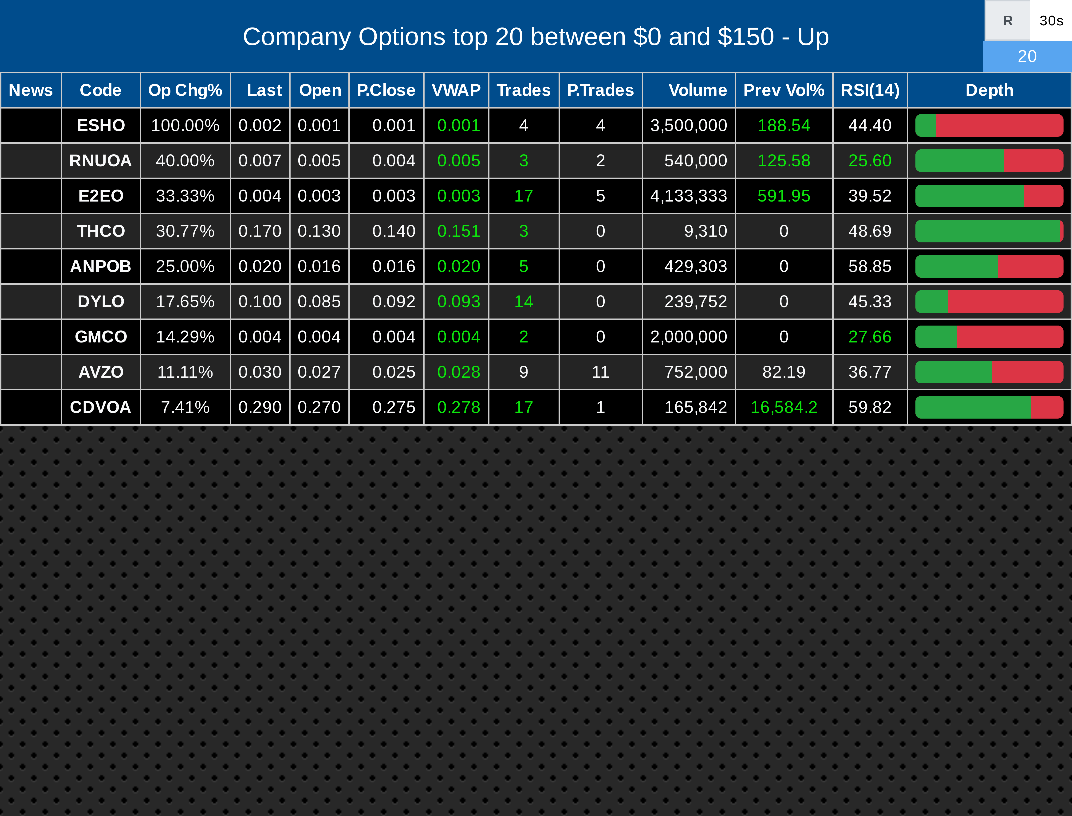 Identifying the top 20 company issued options by change % since open. Quickly identify options that can be exchanged for higher profits then their accompanying securities.