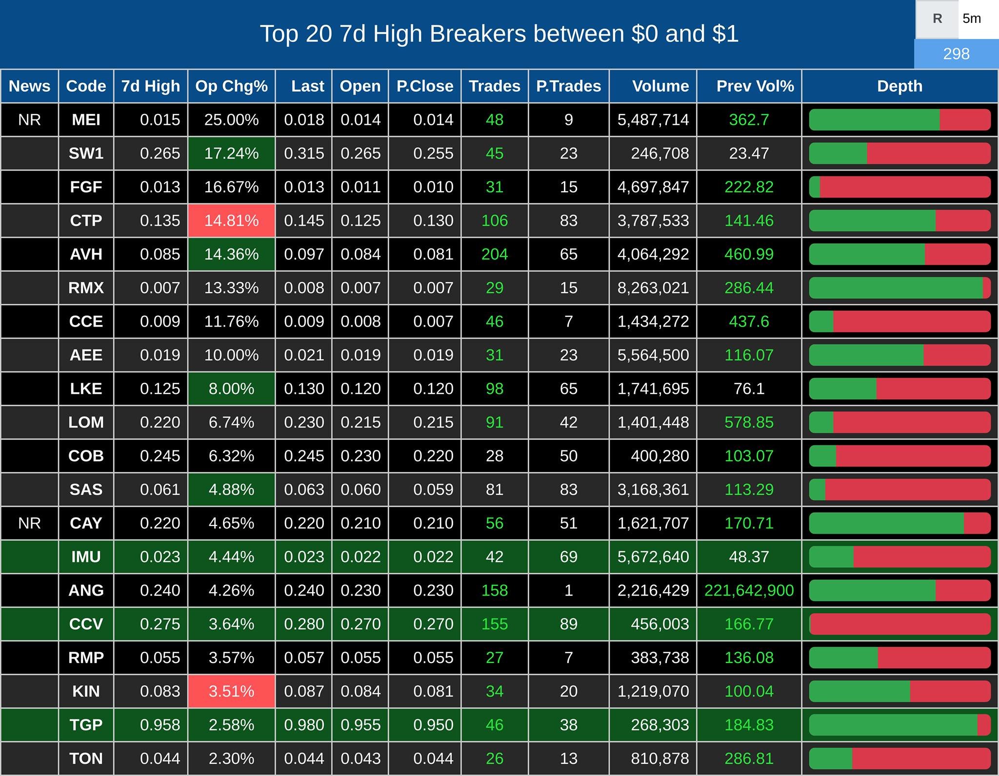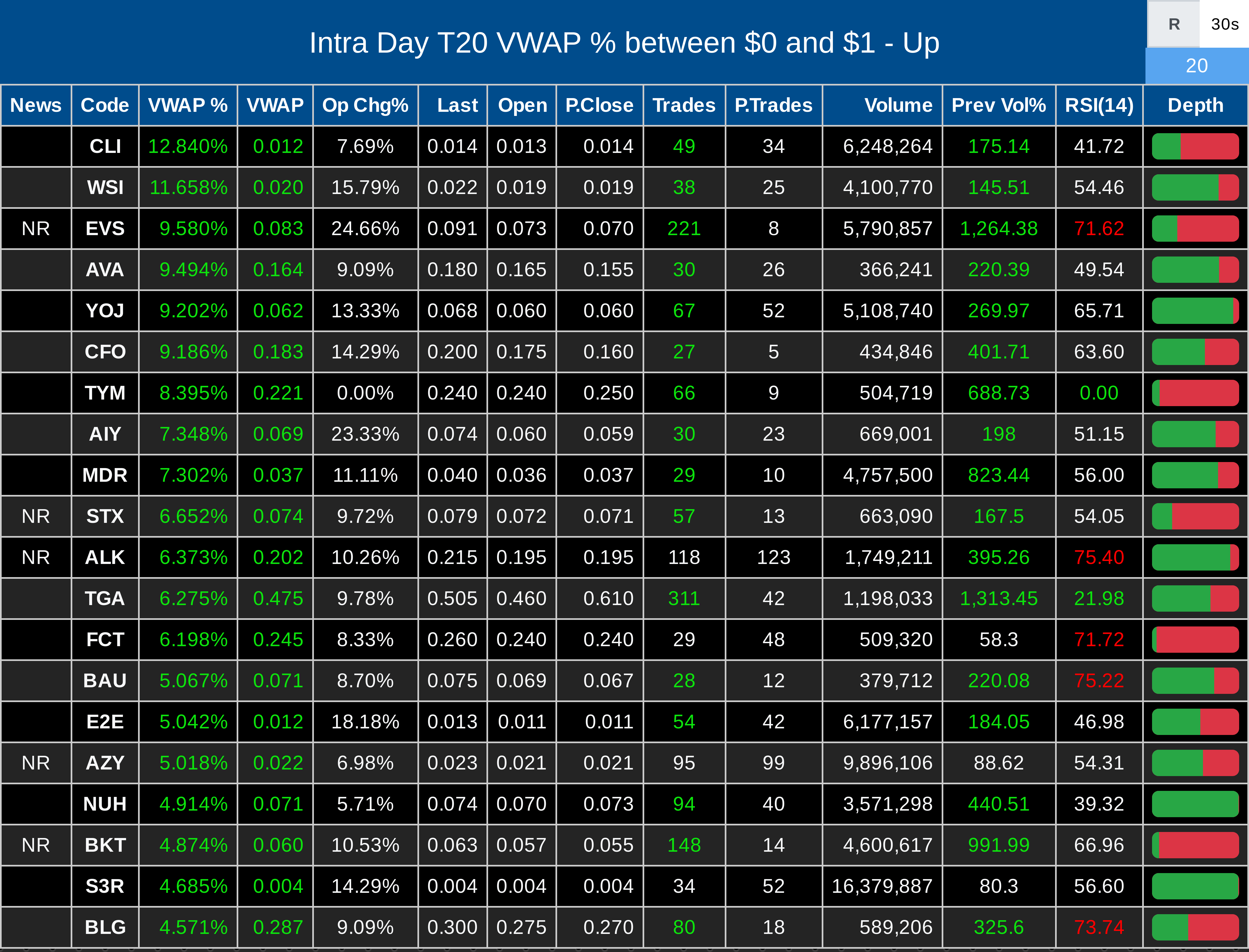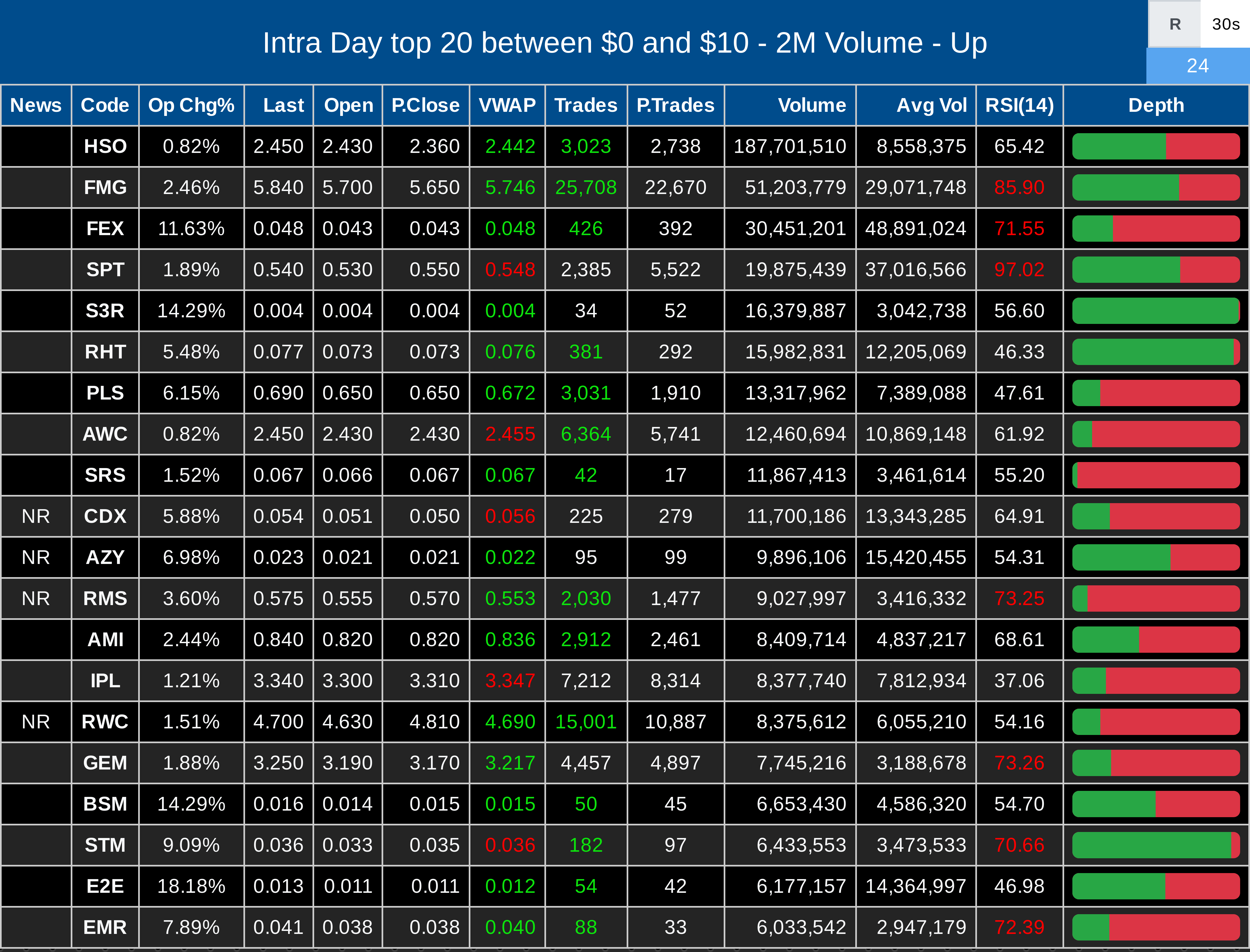 Identifying the Top 20 stocks by price change % since open, our technology accomplishes what no human can do - Watch every trade of every stock on the ASX and Chi-X and notify you about profitable activity so you can be among among the first to act.