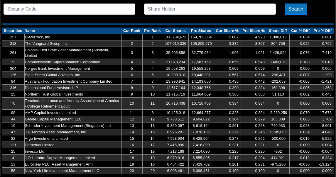 Find the top 20 investors in any stock and cross reference with other securities they own or simply see how the shares are distributed compared to the rest of the shareholders.